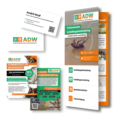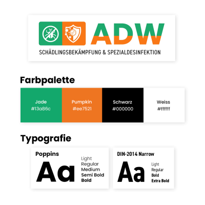 Für ADW Schädlingsbekämpfung entwickelten wir ein modernes Corporate Design mit einer klaren Wort-Bild-Marke und passenden Icons für Schädlingsbekämpfung und Spezialdesinfektion. Die Farben Orange (Energie, Notfalldienst) und Grün (Nachhaltigkeit, Verantwortung) setzen gezielte Akzente.